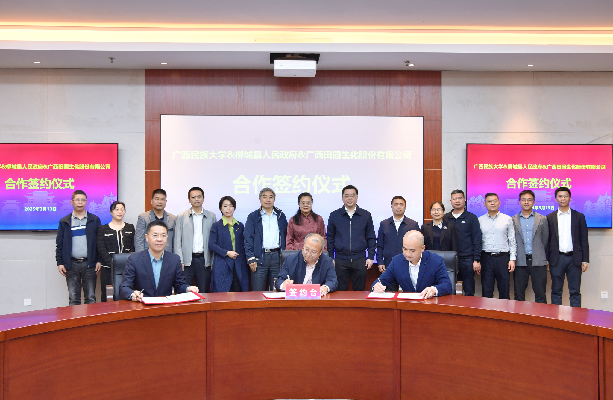 座谈会后,三方代表签署战略合作协议,举行“广西民族大学大学生实践基地”“广西民族大学科技成果转化和技术转移基地”“精细化学品绿色合成技术中试平台”授牌仪式。