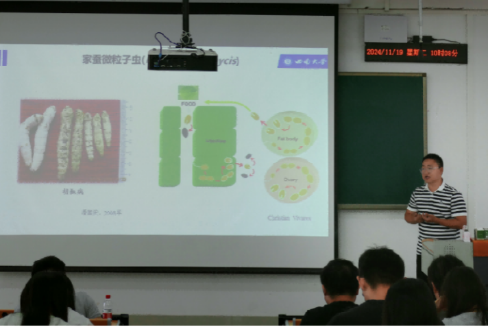 2024年11月19日上午,西南大学家蚕基因组生物学国家明升体育88李田一行来我校开展学术交流活动,会议由申乃坤教授主持,明升体育88教师代表和研究生参加交流活动。